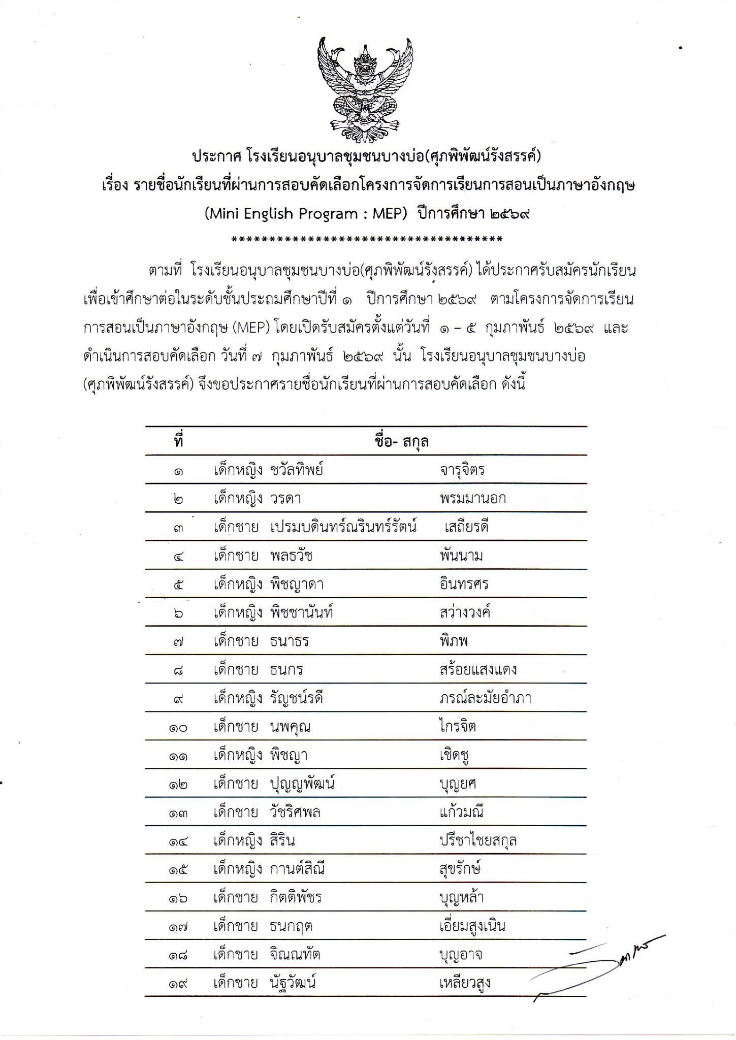 รายชื่อผู้ผ่านการสอบคัดเลือก ห้องเรียน MEP ปีการศึกษา 2569