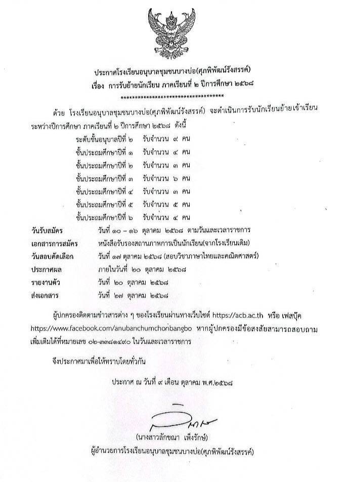 เปิดรับนักเรียนย้ายเข้าระหว่างปีการศึกษา ภาคเรียนที่ 2 ปีการศึกษา 2568