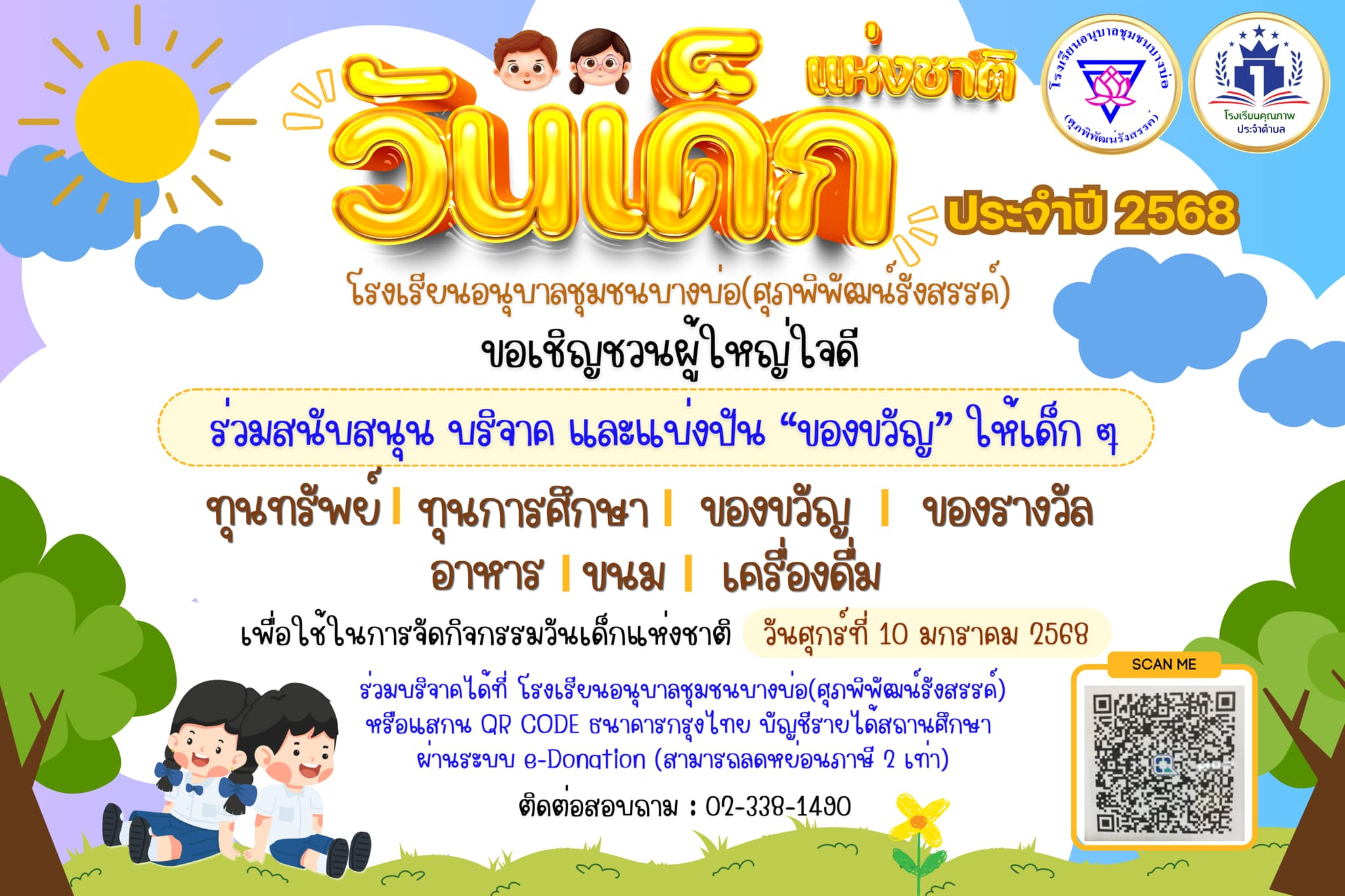 ขอเชิญผู้ใหญ่ใจดีร่วมบริจาค แบ่งปัน สนับสนุน กิจกรรมวันเด็กแห่งชาติประจำปี 2568 โรงเรียนอนุบาลชุมชนบางบ่อ (ศุภพิพัฒน์รังสรรค์)