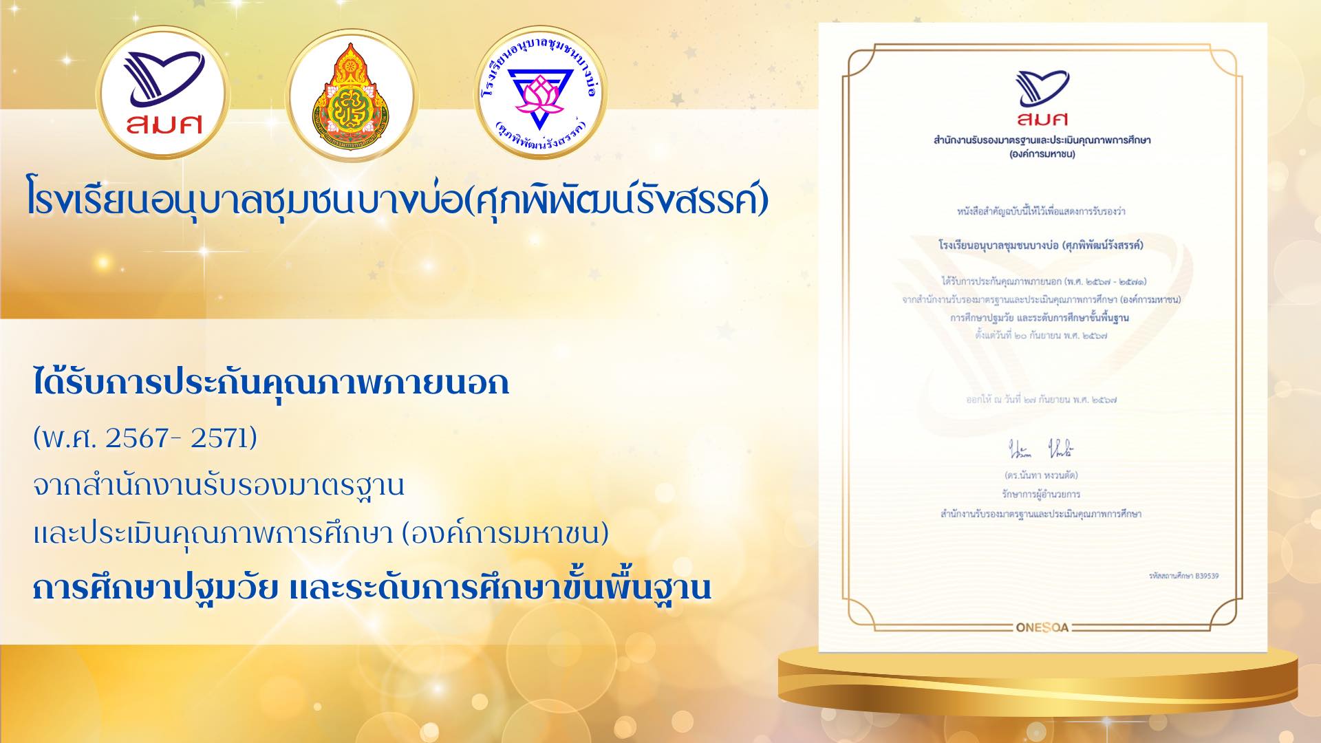 โรงเรียนอนุบาลชุมชนบางบ่อ(ศุภพิพัฒน์รังสรรค์) ได้รับการประกันคุณภาพภายนอก รอบที่ 5 (พ.ศ. 2567- 2571)