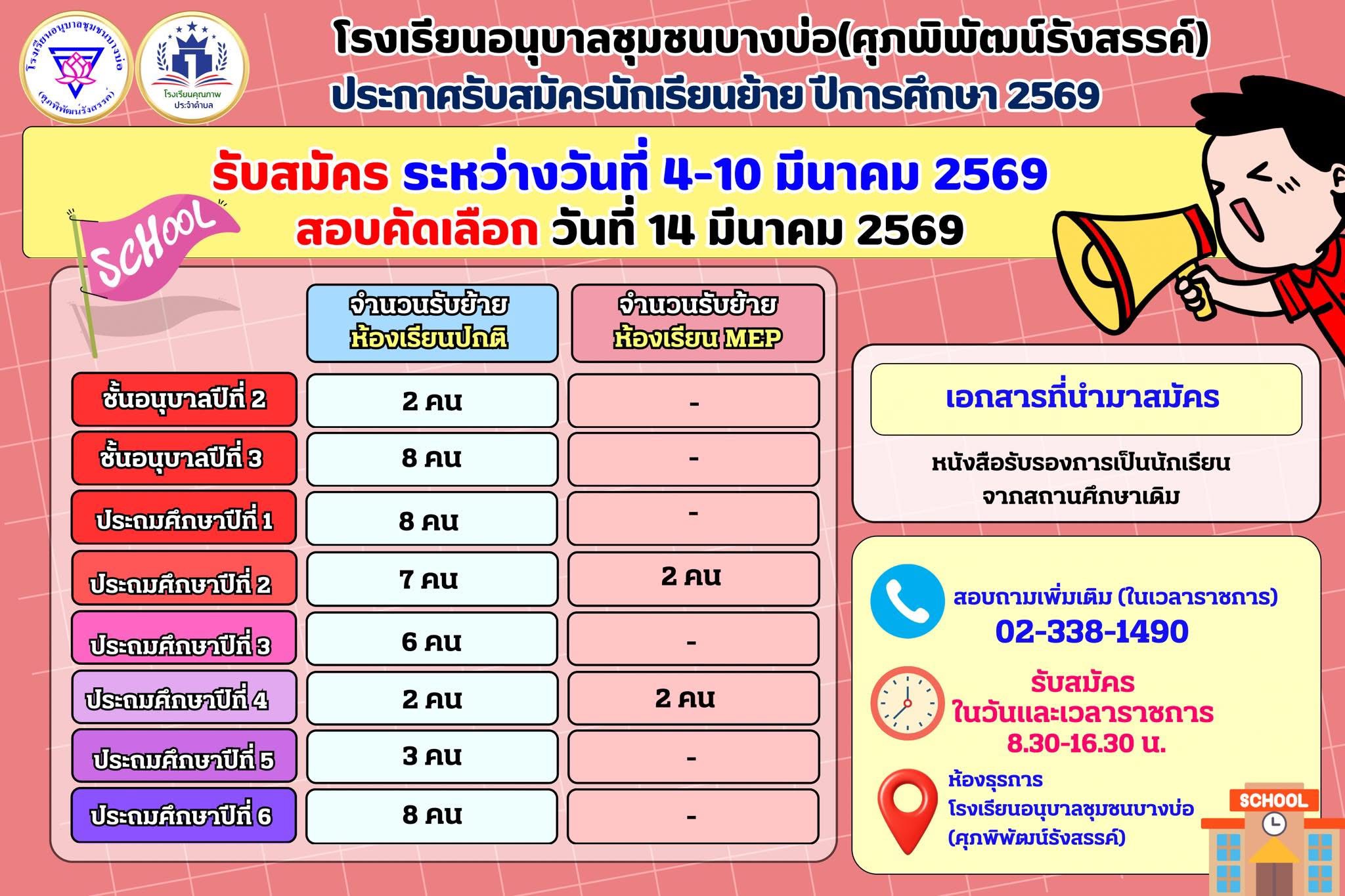 รับสมัครนักเรียนเข้าใหม่และรับย้ายนักเรียน ปีการศึกษา 2569