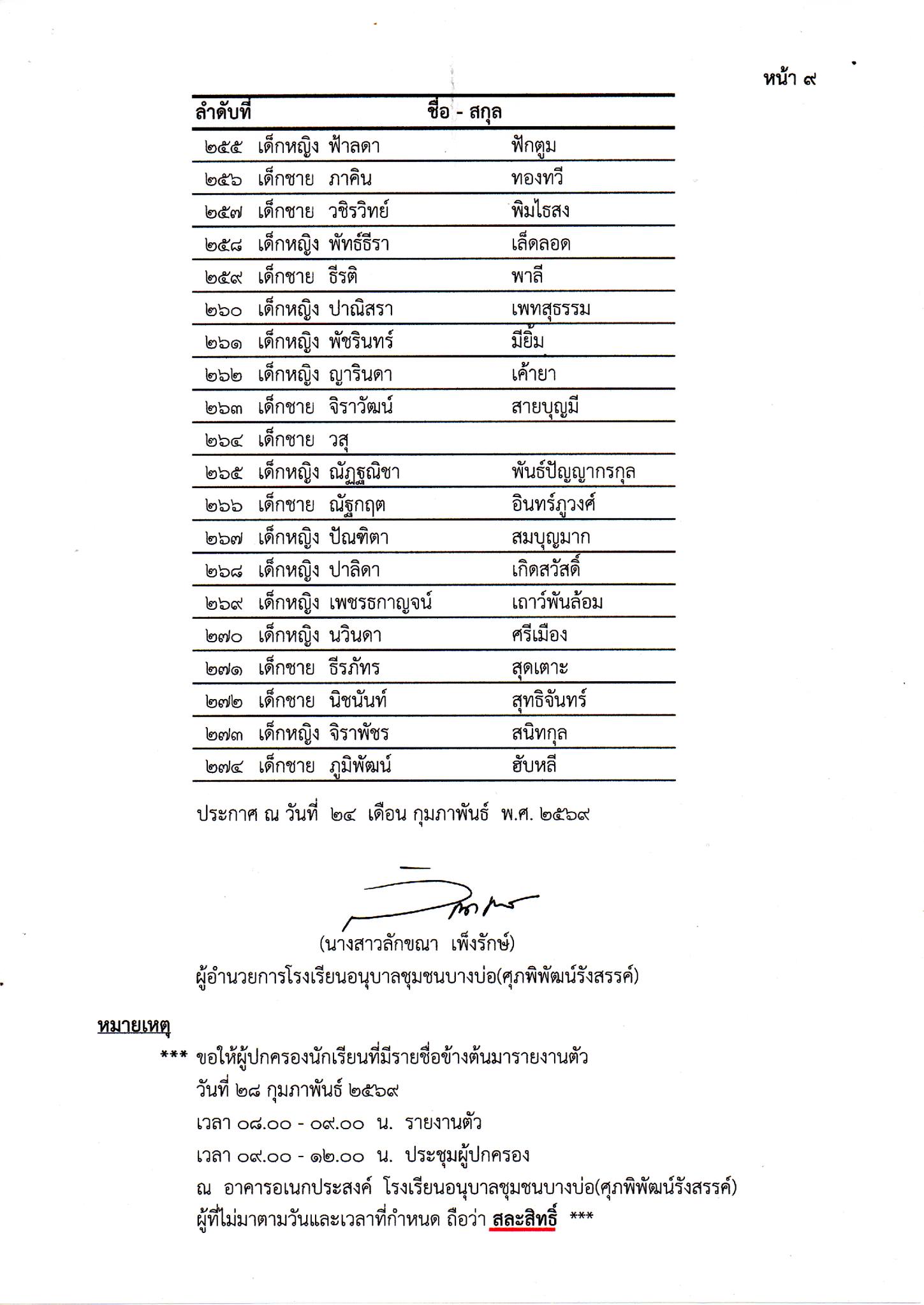ให้ผู้ปกครองนักเรียนมารายงานตัวตามรายละเอียดท้ายประกาศ