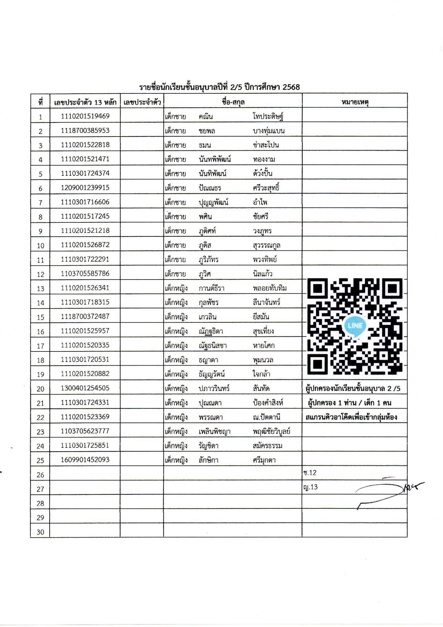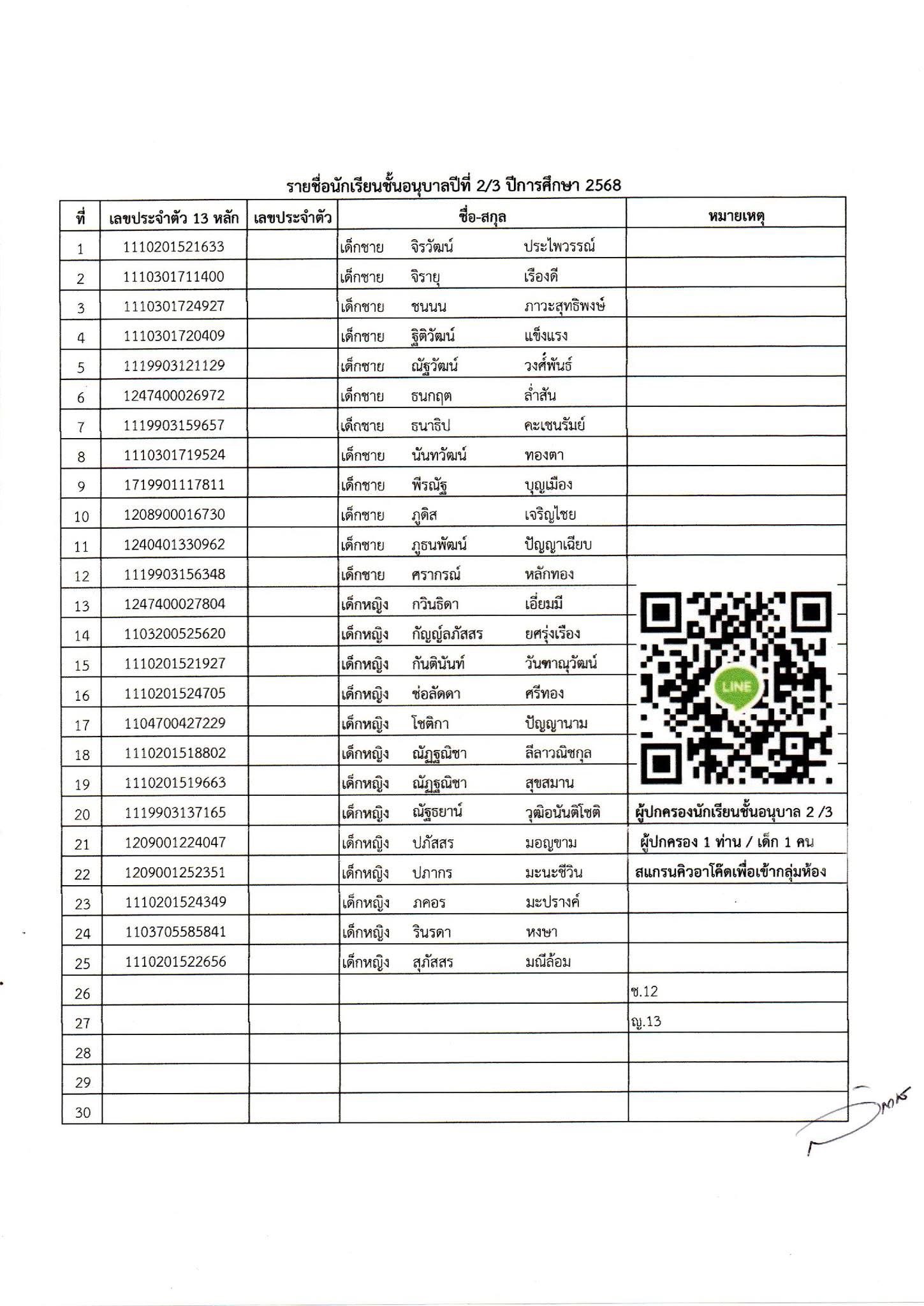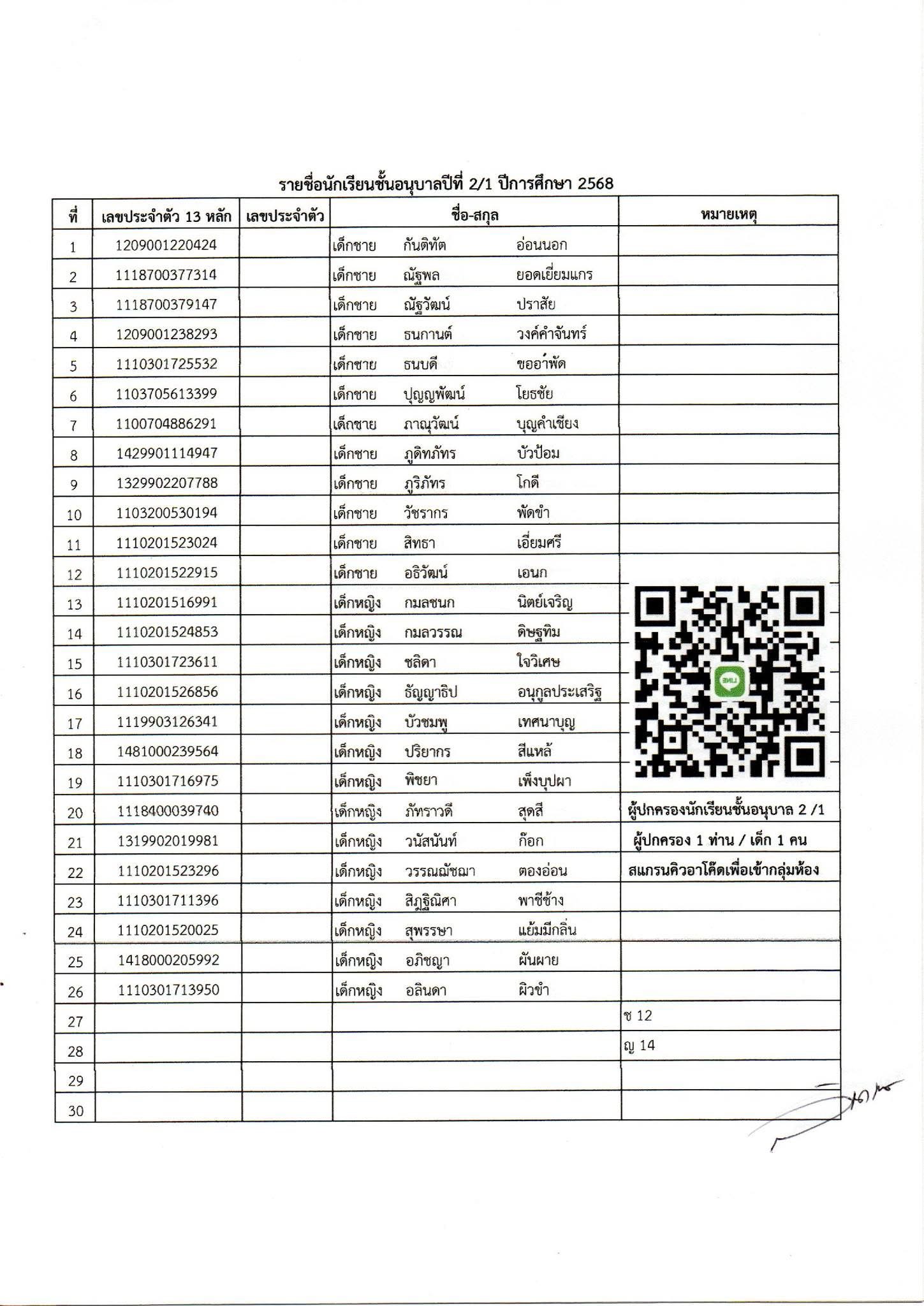 รายชื่อนักเรียนชั้นอนุบาลปีที่ 2 ปีการศึกษา 2568 (จัดห้องเรียน)