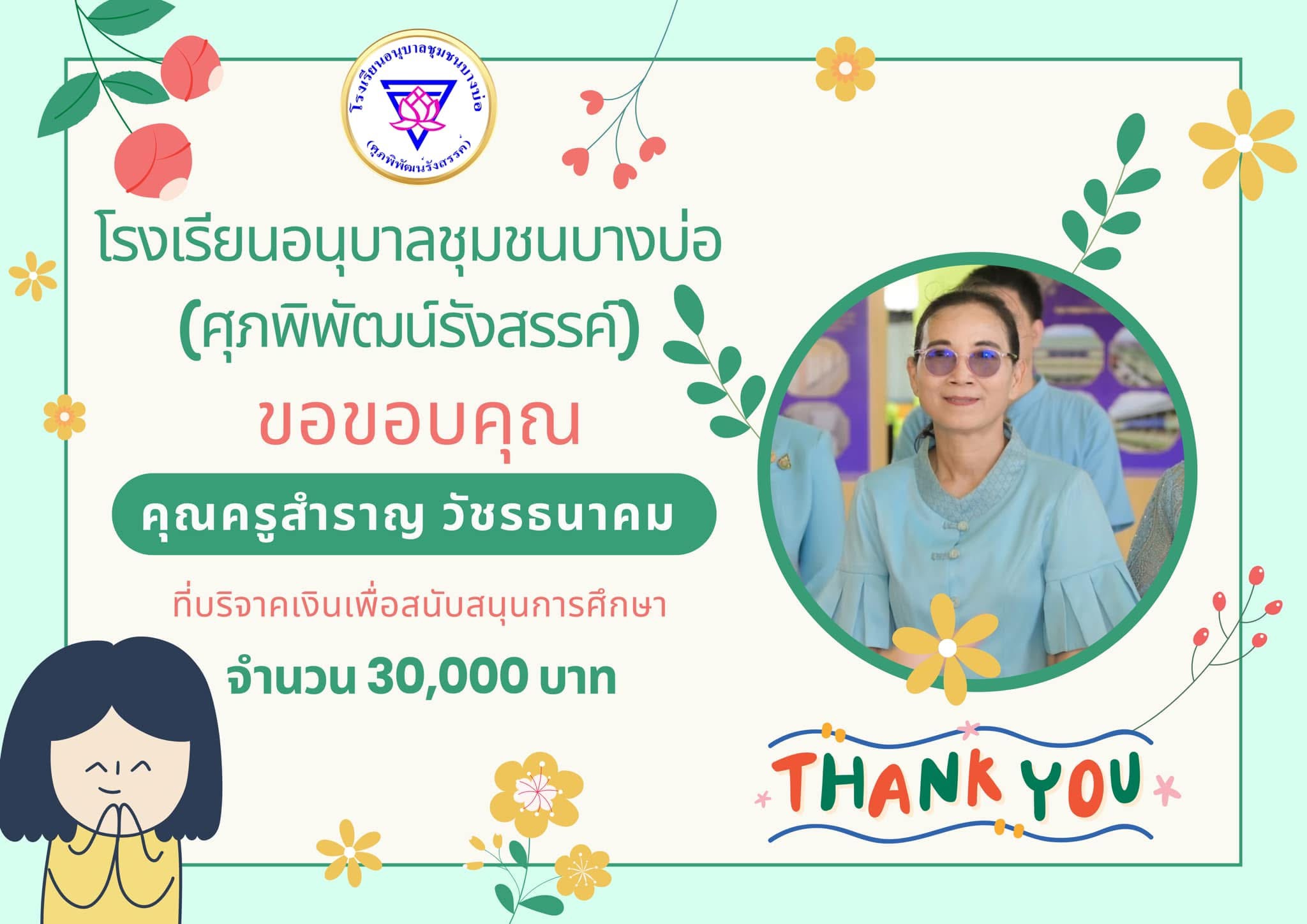 โรงเรียนอนุบาลชุมชนบางบ่อ(ศุภพิพัฒน์รังสรรค์) ขอขอบคุณ คุณครูสำราญ วัชรธนาคม ที่บริจาคเงินเพื่อสนับสนุนการศึกษา